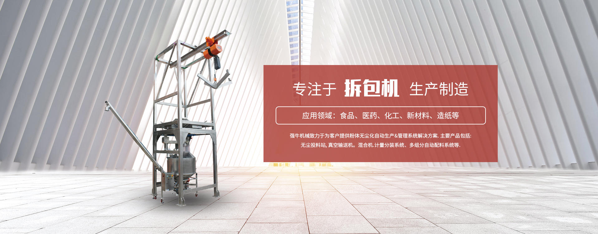 拆包機廠家:強牛機械致力于為客戶提供粉體無塵化自動生產&管理系統解決方案.